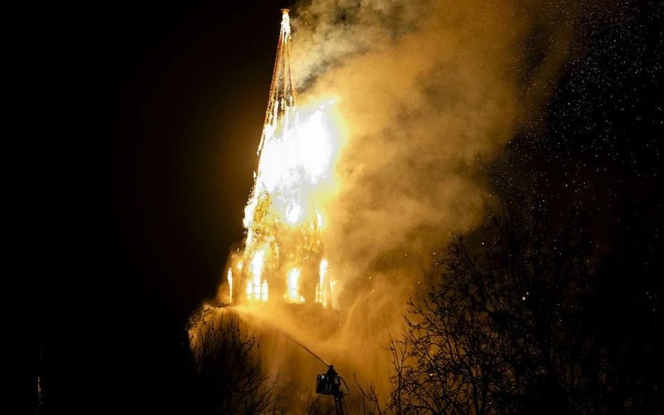 Вогонь охопив шпиль церкви, який згодом повністю обвалився всередину будівлі.